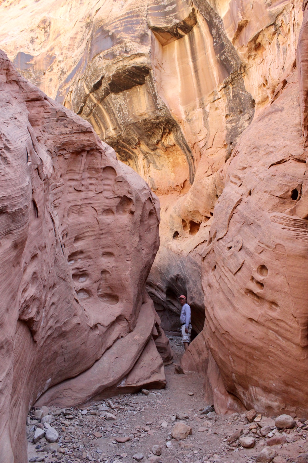 Today (9/26) we explored our first slot canyon, Little Wild Horse Canyon, just outside Goblin Valley State Park. A slot canyon is a very narrow canyon with high walls which make it extremely hazardous in stormy weather due to the danger of flash floods. The entrance to the canyon was full of water so we climbed up the rocks along the side and then down into the canyon a little further in where it was dry. The next time we encountered water was in a very narrow section of the canyon and the only way to proceed was to go through it for about 20 feet. Mark was wearing shorts and waded ahead. The deepest part was halfway to his knees. I really didn't want to get my shoes, socks and jeans wet and was hesitant to continue. While Mark was checking ahead to see if there was more water around the bend, another hiker appeared. His name was Robert and he wasn't keen on getting wet feet either. He worked his way OVER the water by bracing himself between the canyon walls and moving along like spiderman. He encouraged me to try it but there was no way that I was strong enough. I ended up on Mark's back as we squeezed laughing and stumbling through the narrow walls of the canyon. We continued on for quite a ways until we encountered a longer stretch of water. Robert and I sent Mark ahead to check it out since he was already wet. It kept getting deeper and deeper, though, so when it reached the bottom of his shorts he decided it was time to turn back. We retraced our steps and returned to the parking area about 3 hours from the time we had started out. It was a fun morning.